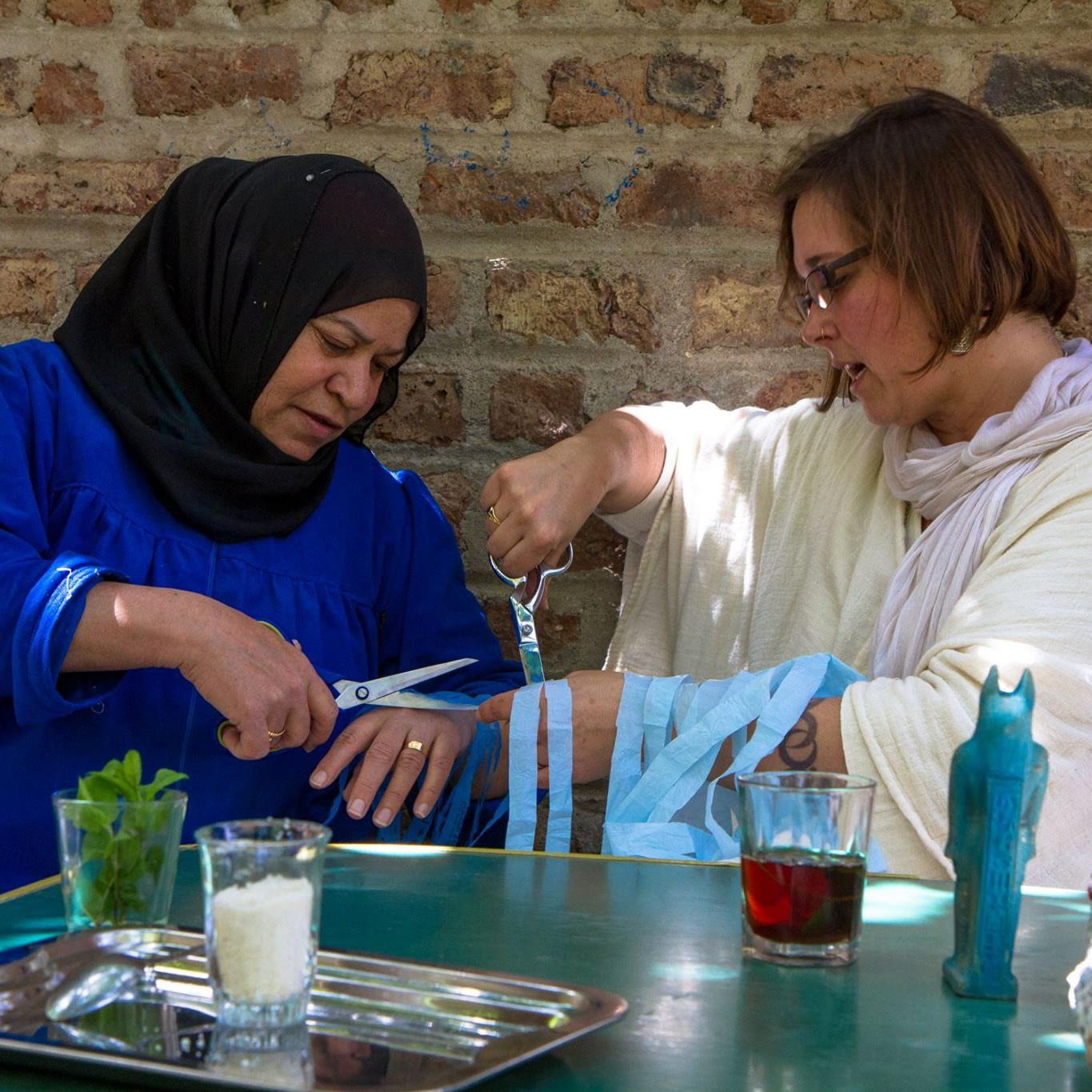 2015: Zahra Indigo teaching Hadia how to make plarn in Abydos, Egypt